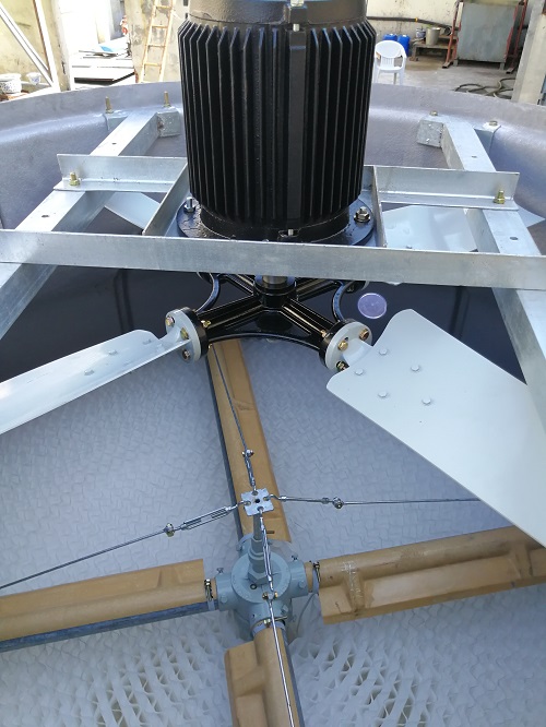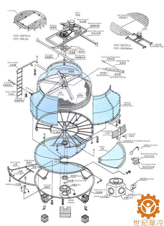 (4)风机:由清华大学工程力学系根据系列冷却塔参数设计的低噪声、高效率风机,铝合金板翼型或玻璃钢叶片、噪声小、效率高。
